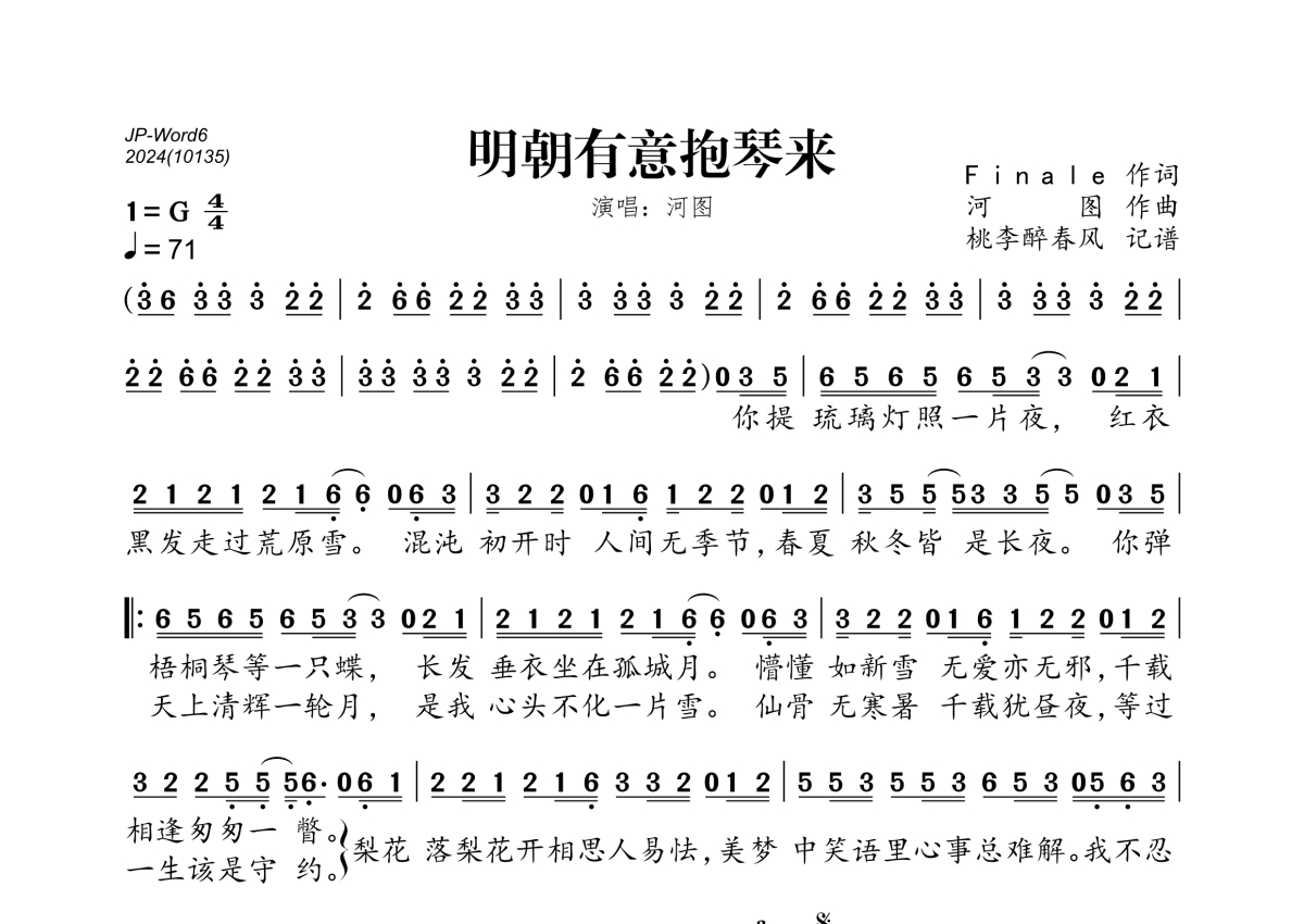 《明朝有意抱琴来》是河图演唱的一首歌曲,拍号为4/4拍,歌曲速度为每分钟71拍,这份简谱共有一张高清图谱,图谱由 @桃李醉春风 编配上传。