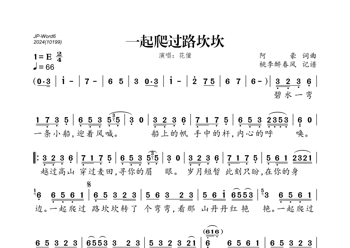 《一起爬过路坎坎》是花僮演唱的一首歌曲,拍号为2/4拍,歌曲速度为每分钟66拍,这份简谱共有一张高清图谱,图谱由 @桃李醉春风 编配上传。