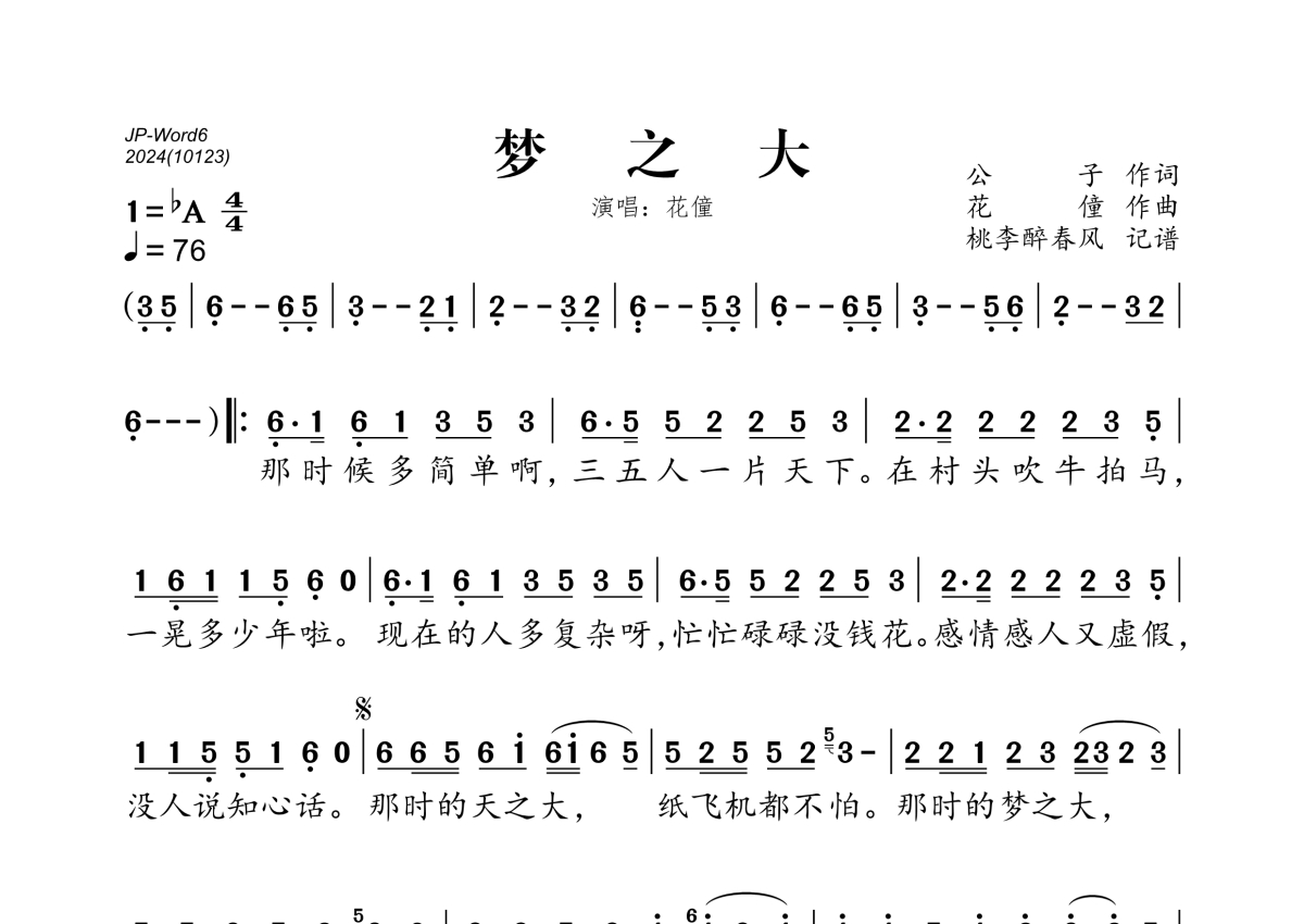 《梦之大》是花僮演唱的一首歌曲,拍号为4/4拍,歌曲速度为每分钟76拍,这份简谱共有一张高清图谱,图谱由 @桃李醉春风 编配上传。