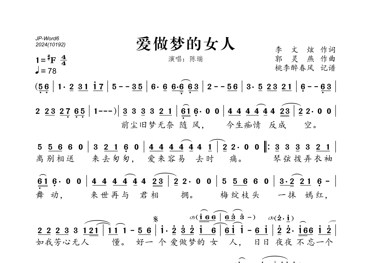 《爱做梦的女人》是陈瑞演唱的一首歌曲,拍号为4/4拍,歌曲速度为每分钟78拍,这份简谱共有一张高清图谱,图谱由 @桃李醉春风 编配上传。