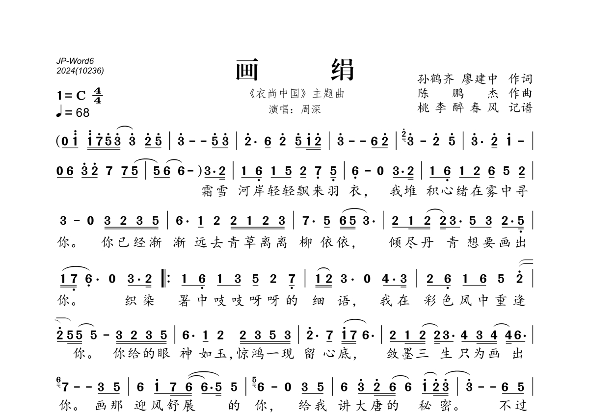 《画绢》是周深演唱的一首歌曲,拍号为4/4拍,歌曲速度为每分钟68拍,这份简谱共有一张高清图谱,图谱由 @桃李醉春风 编配上传。