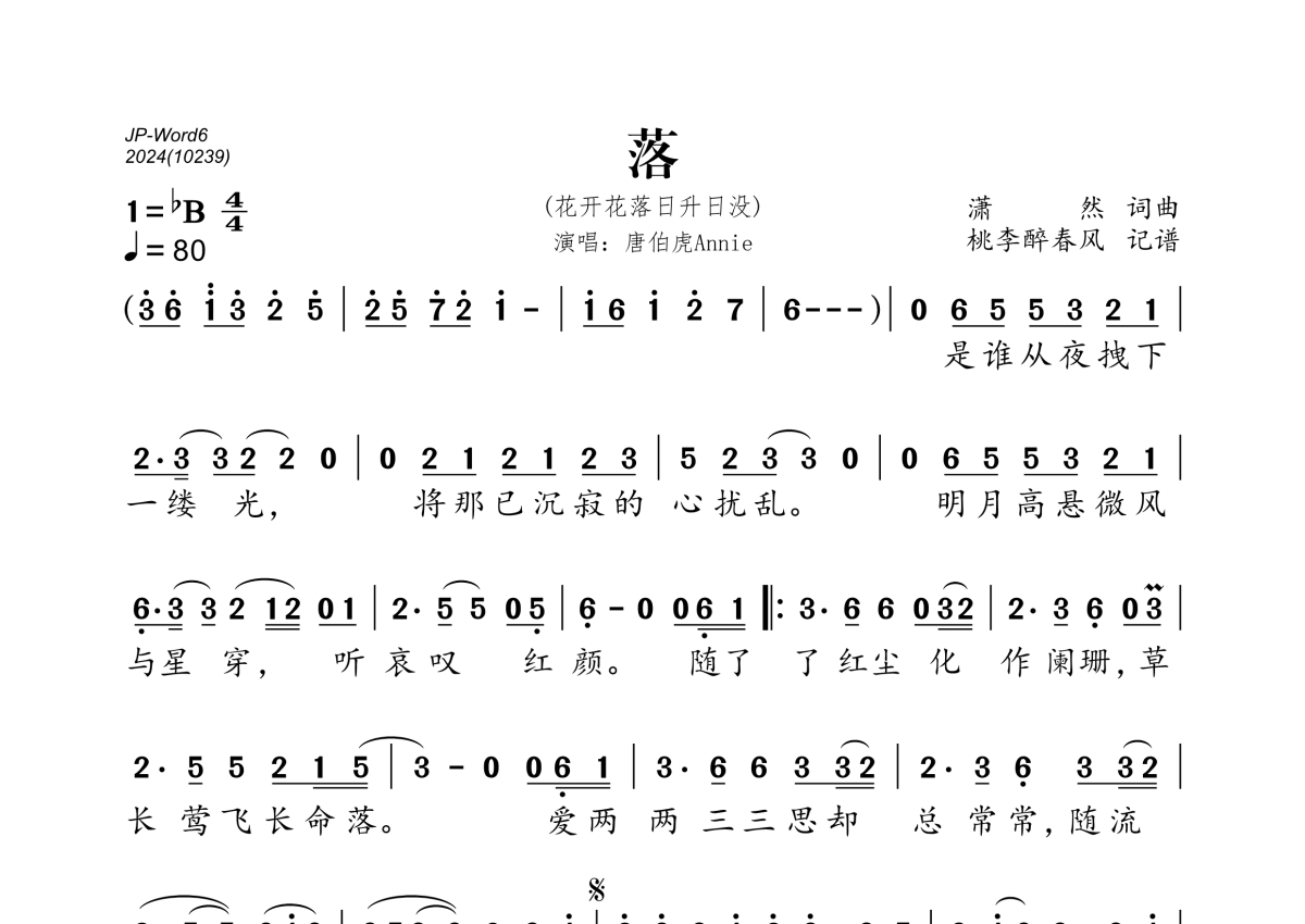 《落》是唐伯虎Annle演唱的一首歌曲,拍号为4/4拍,歌曲速度为每分钟80拍,这份简谱共有一张高清图谱,图谱由 @桃李醉春风 编配上传。