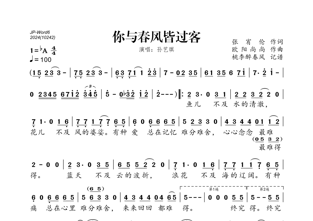 《你与春风皆过客》是孙艺琪演唱的一首歌曲,拍号为4/4拍,歌曲速度为每分钟100拍,这份简谱共有一张高清图谱,图谱由 @桃李醉春风 编配上传。