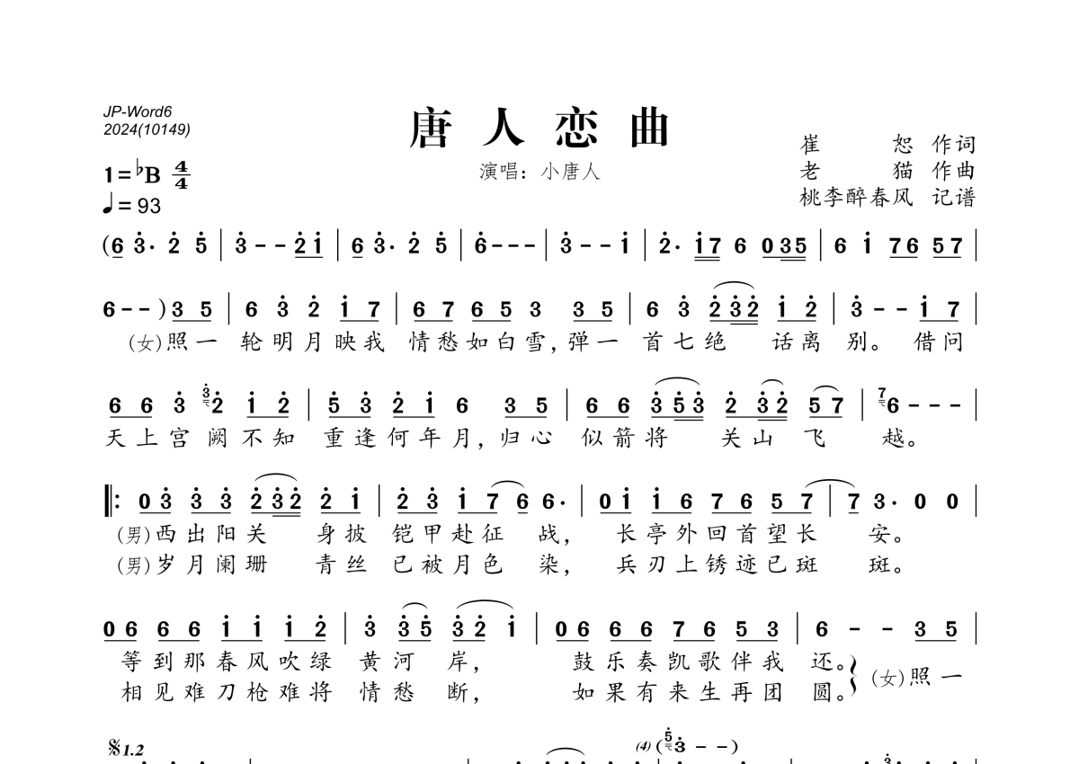 《唐人恋曲》是小唐人演唱的一首歌曲,拍号为4/4拍,歌曲速度为每分钟93拍,这份简谱共有一张高清图谱,图谱由 @桃李醉春风 编配上传。