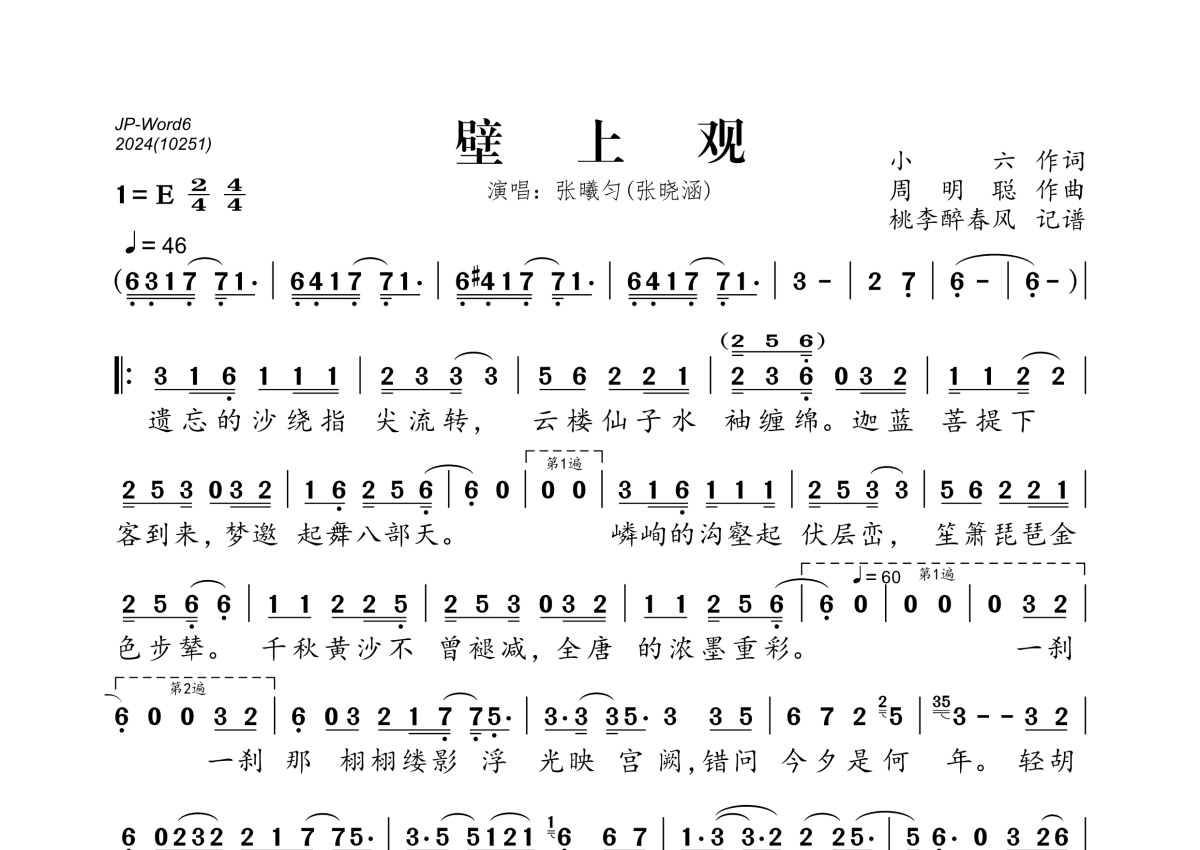 《壁上观》是张曦匀(张晓涵)演唱的一首歌曲,拍号为4/4拍,歌曲速度为每分钟46拍,这份简谱共有一张高清图谱,图谱由 @桃李醉春风 编配上传。