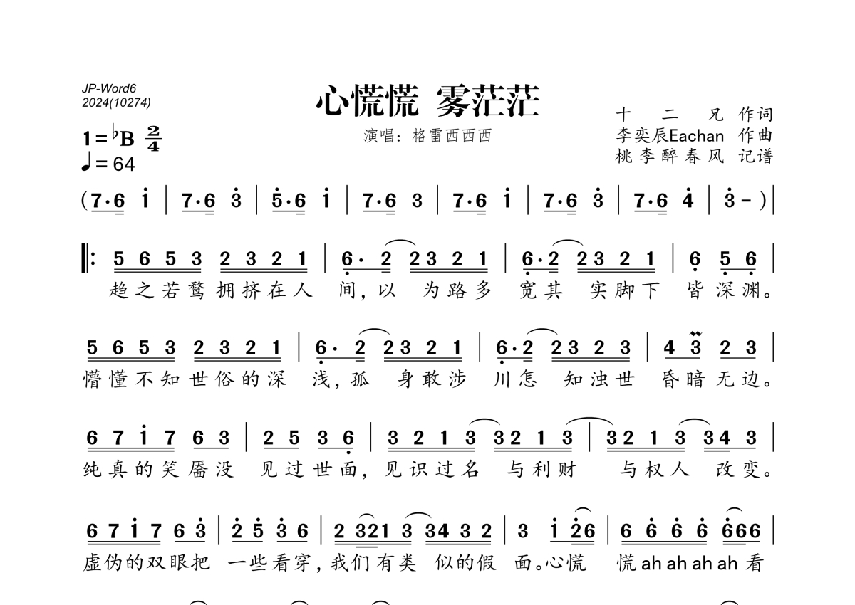 《心慌慌 雾茫茫》是河图演唱的一首歌曲,拍号为2/4拍,歌曲速度为每分钟64拍,这份简谱共有一张高清图谱,图谱由 @桃李醉春风 编配上传。