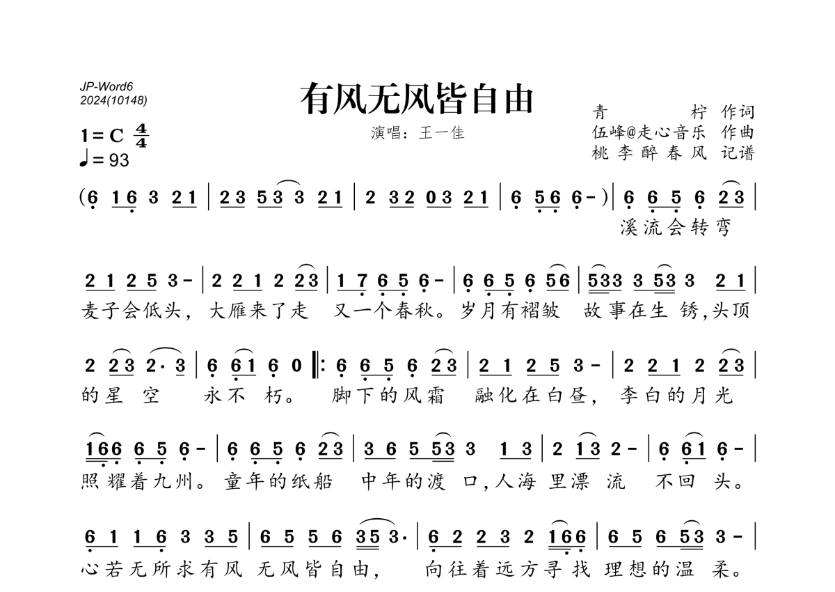 《有风无风皆自由》是王馨演唱的一首歌曲,拍号为4/4拍,歌曲速度为每分钟93拍,这份简谱共有一张高清图谱,图谱由 @桃李醉春风 编配上传。
