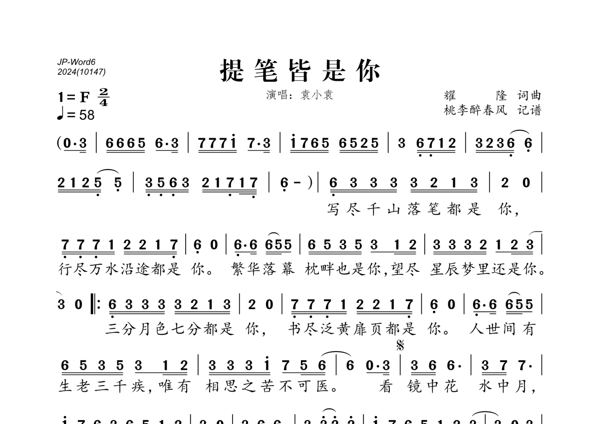 《提笔皆是你》是赵希予演唱的一首歌曲,拍号为2/4拍,歌曲速度为每分钟58拍,这份简谱共有一张高清图谱,图谱由 @桃李醉春风 编配上传。
