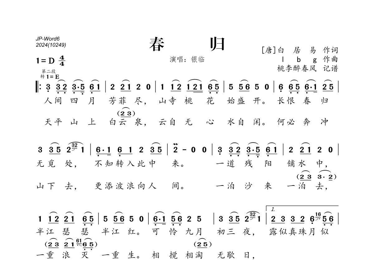《春归》是银临演唱的一首歌曲,拍号为4/4拍,这份简谱共有一张高清图谱,图谱由 @桃李醉春风 编配上传。