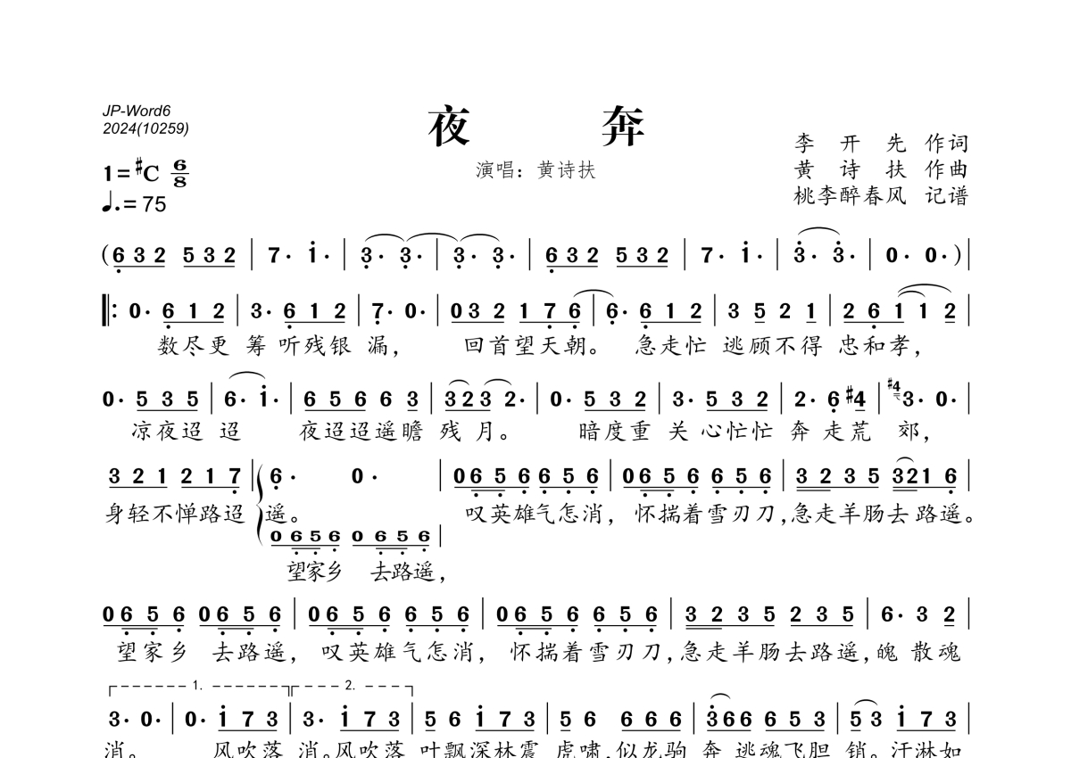 黄诗扶《夜奔》简谱