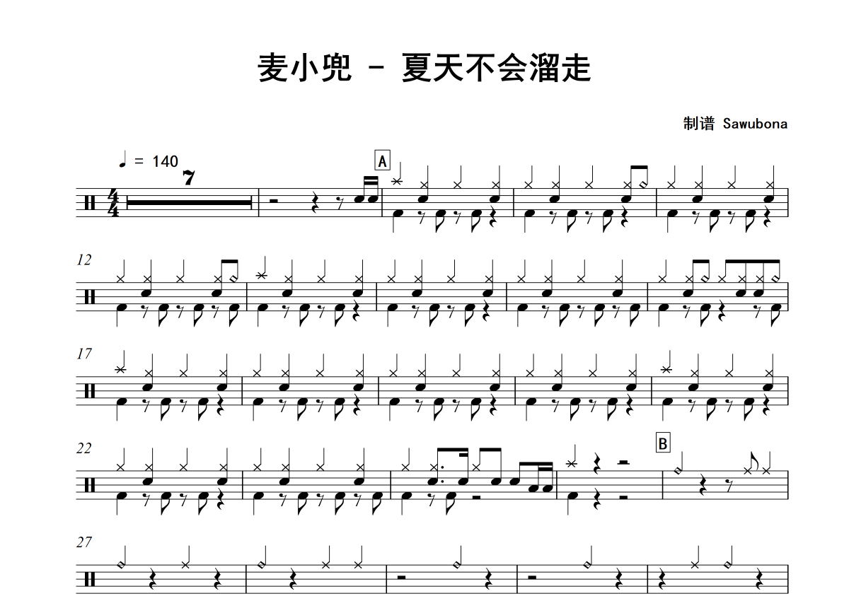 《夏天不会溜走》是麦小兜演唱的一首歌曲,拍号为4/4拍,歌曲速度为每分钟140拍,这份架子鼓谱共有三张高清图谱,图谱由 @Sawubona 编配上传,图谱使用五线谱编配,使用这份夏天不会溜走架子鼓谱,你将能够轻松地敲打出这首麦小兜的夏天不会溜走,快来尝试吧。