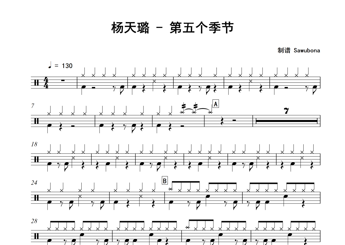 《第五个季节》是杨天璐演唱的一首歌曲,拍号为4/4拍,歌曲速度为每分钟130拍,这份架子鼓谱共有两张高清图谱,图谱由 @Sawubona 编配上传,图谱使用五线谱编配,使用这份第五个季节架子鼓谱,你将能够轻松地敲打出这首杨天璐的第五个季节,快来尝试吧。