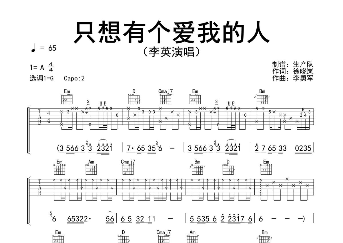 《只想有个爱我的人》是李英演唱的一首歌曲,精编完美版,拍号为4/4拍,歌曲速度为每分钟65拍,歌曲原调为A调,但由于原调指法比较难,为了方便弹奏,本吉他谱采用的是G调指法编配,变调夹2品弹奏即为原调,当然也可以根据自己的音域改变变调夹位置,或者通过改变和弦调性,以方便自己弹奏,这份吉他谱共有三张高清图谱,图谱由 @生产队 编配上传,图谱使用六线谱编配,包含吉他和弦指法、简谱以及歌词部分,使用这份只想有个爱我的人吉他谱,可以让你更加方便地掌握这首歌曲的弹唱技巧,快来尝试吧。《只想有个爱我的人》是由李英演唱的歌曲。本吉他谱根据原版G调指法编配,完整的前奏、间奏、尾奏solo编配,精编完美版,值得推荐的一首伤感情歌。年轻的时候,只顾着去奋斗,转眼就是一辈子,已别无所求,过了拼搏年纪,就放下烦忧,只想有个爱我的人,陪在身后。