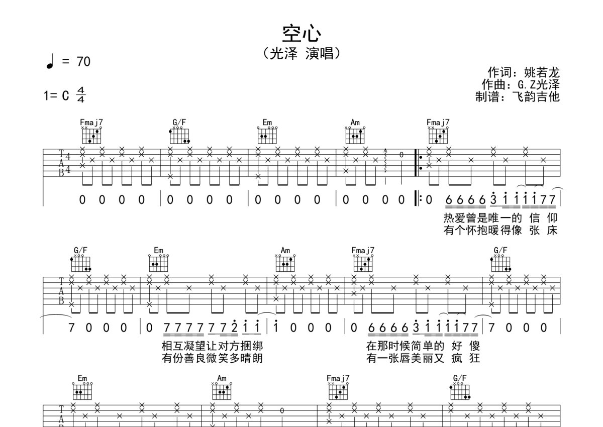 光泽《空心》吉他谱 - C调弹唱六线谱