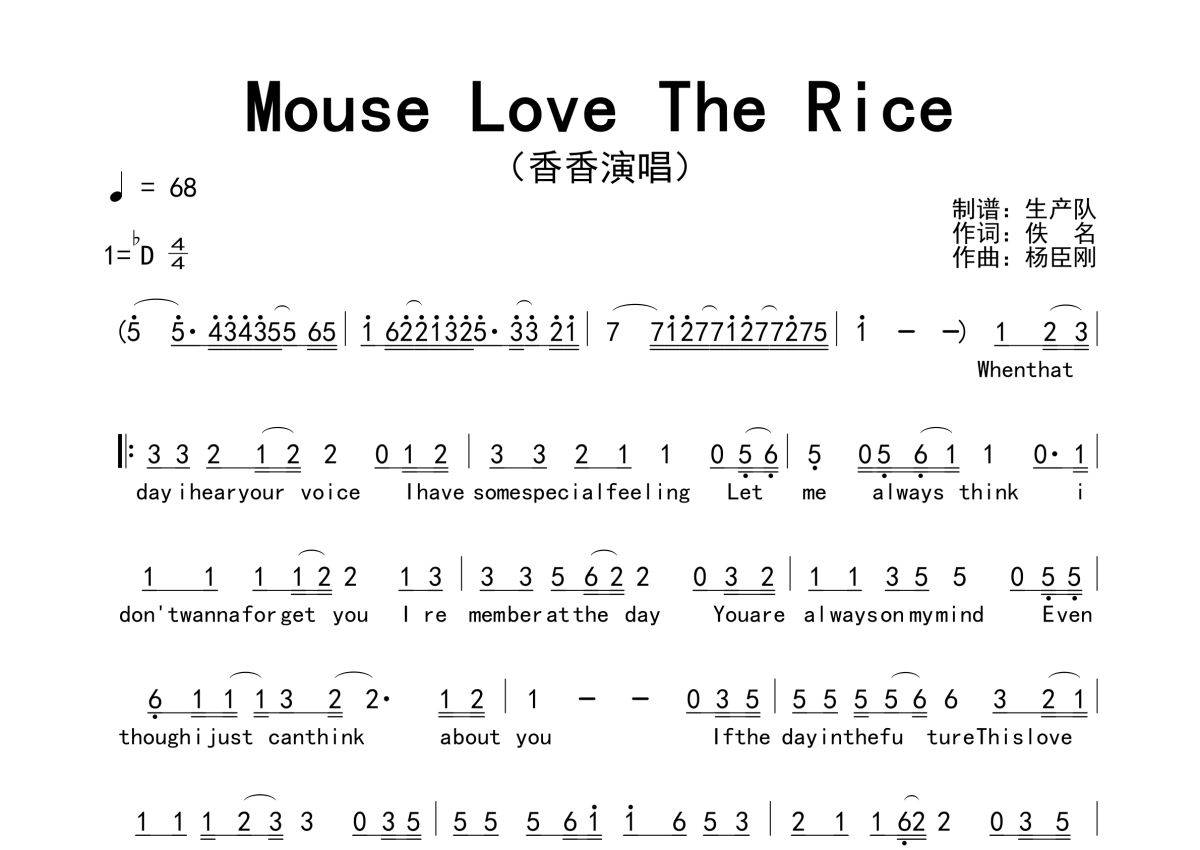 《Mouse Love The Rice》是香香演唱的一首歌曲,拍号为4/4拍,歌曲速度为每分钟68拍,这份简谱共有一张高清图谱,图谱由 @生产队 编配上传。