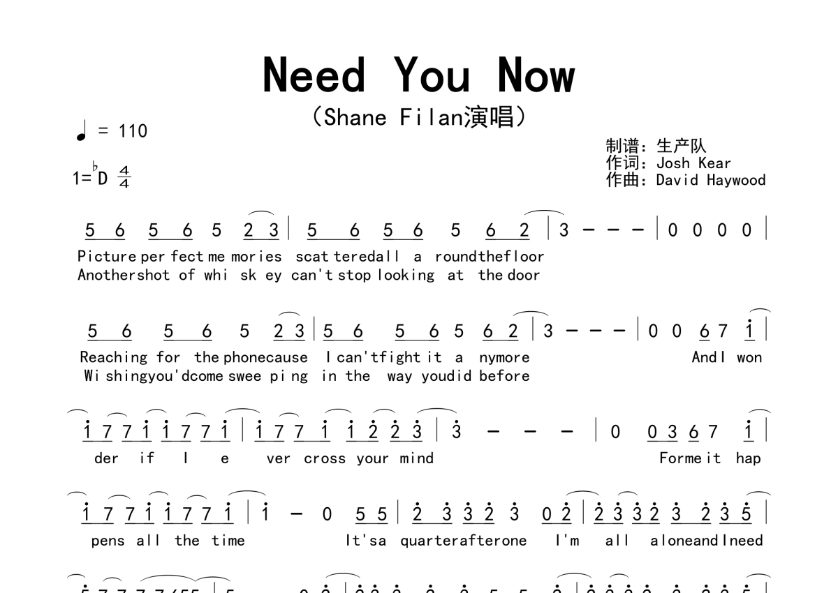 《Need You Now》是Shane Filan演唱的一首歌曲,拍号为4/4拍,歌曲速度为每分钟110拍,这份简谱共有一张高清图谱,图谱由 @生产队 编配上传。