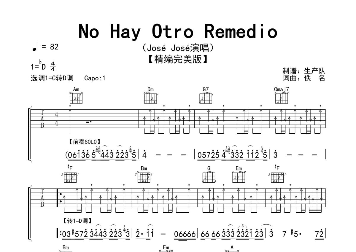 《No Hay Otro Remedio》是José José演唱的一首歌曲,精编完美版,拍号为4/4拍,歌曲速度为每分钟82拍,歌曲原调为Db调,但由于原调指法比较难,为了方便弹奏,本吉他谱采用的是C调指法编配,变调夹1品弹奏即为原调,当然也可以根据自己的音域改变变调夹位置,或者通过改变和弦调性,以方便自己弹奏,这份吉他谱共有三张高清图谱,图谱由 @生产队 编配上传,图谱使用六线谱编配,包含吉他和弦指法、简谱以及歌词部分,使用这份No Hay Otro Remedio吉他谱,可以让你更加方便地掌握这首歌曲的弹唱技巧,快来尝试吧。