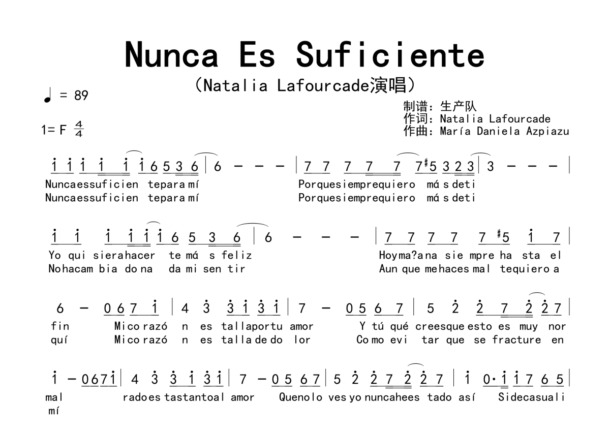 《Nunca Es Suficiente》是Natalia Lafourcade演唱的一首歌曲,拍号为4/4拍,歌曲速度为每分钟89拍,这份简谱共有一张高清图谱,图谱由 @生产队 编配上传。