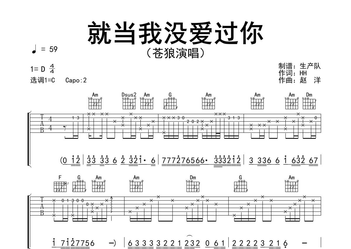 《就当我没爱过你》是苍狼演唱的一首歌曲,精编完美版,拍号为4/4拍,歌曲速度为每分钟59拍,歌曲原调为D调,但由于原调指法比较难,为了方便弹奏,本吉他谱采用的是C调指法编配,变调夹2品弹奏即为原调,当然也可以根据自己的音域改变变调夹位置,或者通过改变和弦调性,以方便自己弹奏,这份吉他谱共有三张高清图谱,图谱由 @生产队 编配上传,图谱使用六线谱编配,包含吉他和弦指法、简谱以及歌词部分,使用这份就当我没爱过你吉他谱,可以让你更加方便地掌握这首歌曲的弹唱技巧,快来尝试吧。《就当我没爱过你》是由苍狼演唱的歌曲。本吉他谱根据原版C调指法编配,完整的前奏、间奏、尾奏solo编配,值得推荐的一首伤感情歌。就当我从来没有爱过你,你早已撇清我们的关系,在这个一无所有的年纪,我连快乐都给不了自己。