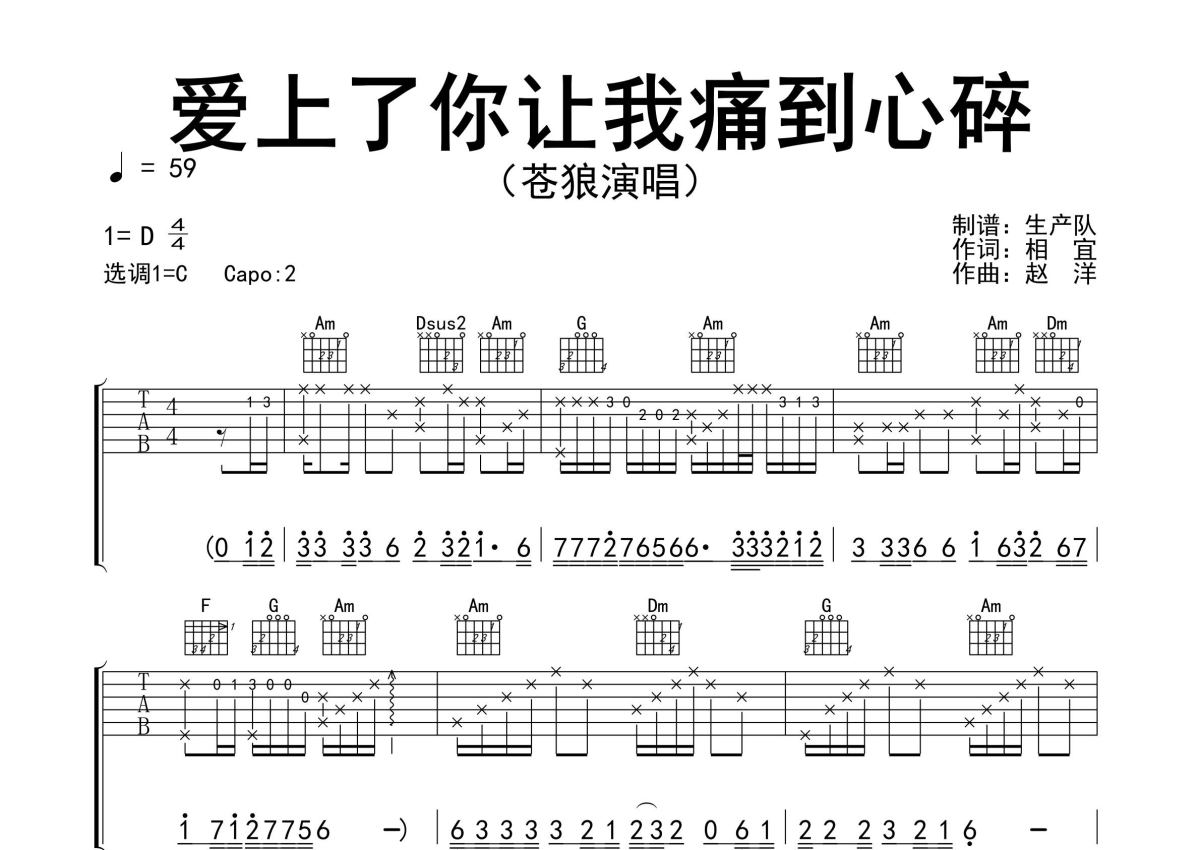 《爱上了你让我痛到心碎》是苍狼演唱的一首歌曲,精编完美版,拍号为4/4拍,歌曲速度为每分钟59拍,歌曲原调为D调,但由于原调指法比较难,为了方便弹奏,本吉他谱采用的是C调指法编配,变调夹2品弹奏即为原调,当然也可以根据自己的音域改变变调夹位置,或者通过改变和弦调性,以方便自己弹奏,这份吉他谱共有三张高清图谱,图谱由 @生产队 编配上传,图谱使用六线谱编配,包含吉他和弦指法、简谱以及歌词部分,使用这份爱上了你让我痛到心碎吉他谱,可以让你更加方便地掌握这首歌曲的弹唱技巧,快来尝试吧。《爱上了你让我痛到心碎》是由苍狼演唱的歌曲。本吉他谱根据原版C调指法编配,完整的前奏、间奏、尾奏solo编配,值得推荐的一首伤感情歌。爱上了你让我痛到心碎,你转身离去头也不再回,枉我今生痴情爱你一回,伤透的心还能再去爱谁。