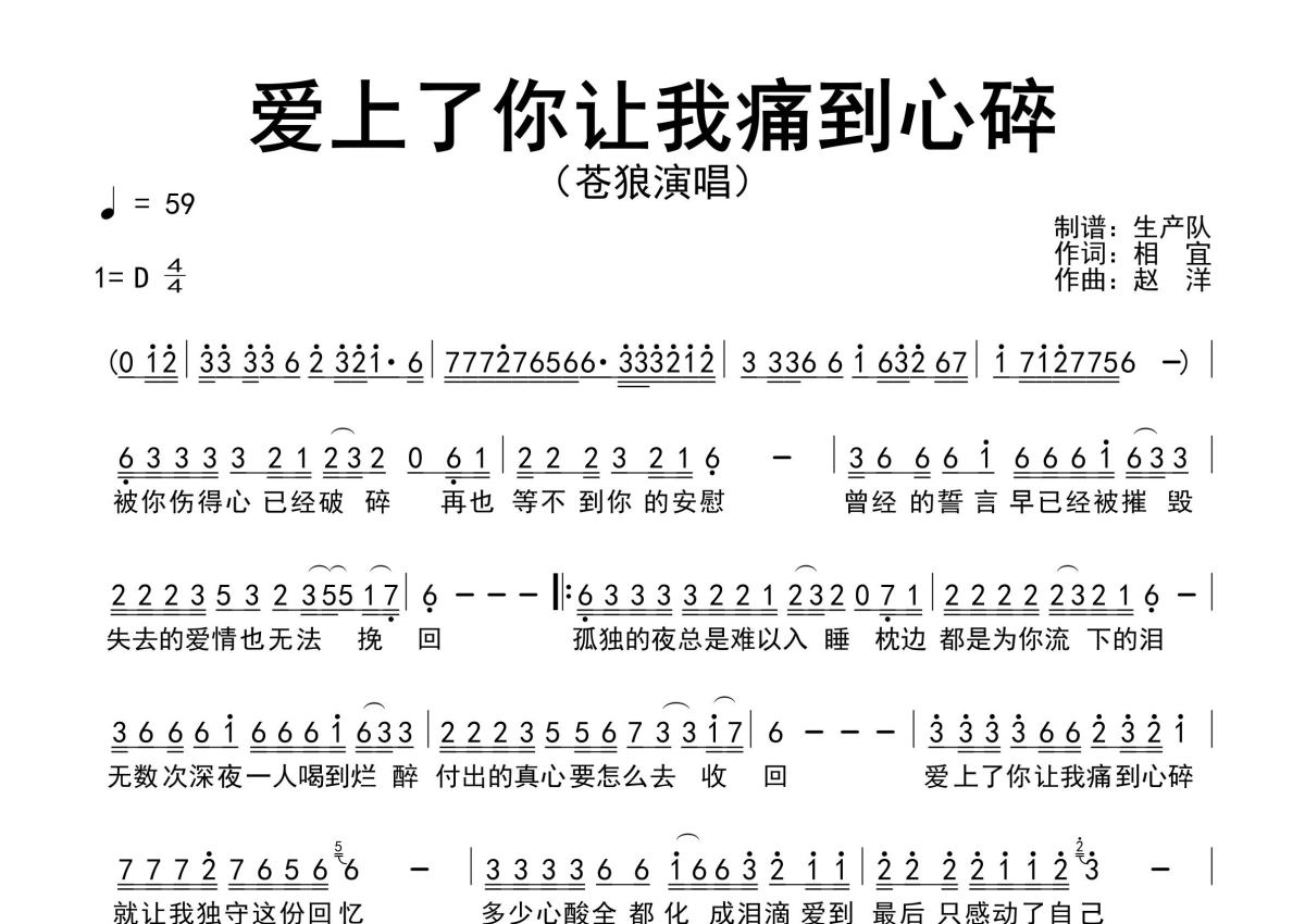 《爱上了你让我痛到心碎》是苍狼演唱的一首歌曲,原版简谱,拍号为4/4拍,歌曲速度为每分钟59拍,这份简谱共有一张高清图谱,图谱由 @生产队 编配上传苍狼演唱的歌曲《爱上了你让我痛到心碎》原版简谱,完整的前奏、间奏、尾奏solo编配。