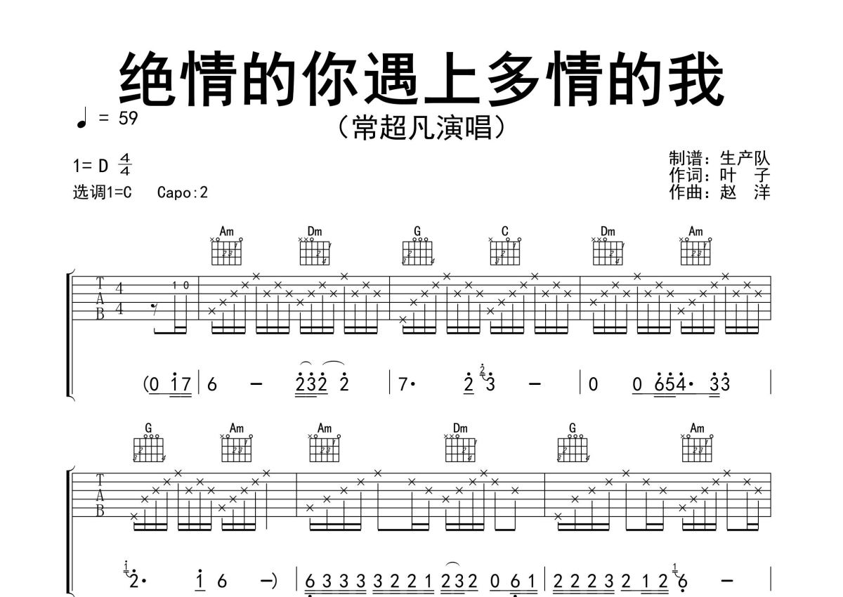《绝情的你遇上多情的我》是常超凡演唱的一首歌曲,精编完美版,拍号为4/4拍,歌曲速度为每分钟59拍,歌曲原调为D调,但由于原调指法比较难,为了方便弹奏,本吉他谱采用的是C调指法编配,变调夹2品弹奏即为原调,当然也可以根据自己的音域改变变调夹位置,或者通过改变和弦调性,以方便自己弹奏,这份吉他谱共有三张高清图谱,图谱由 @生产队 编配上传,图谱使用六线谱编配,包含吉他和弦指法、简谱以及歌词部分,使用这份绝情的你遇上多情的我吉他谱,可以让你更加方便地掌握这首歌曲的弹唱技巧,快来尝试吧。《绝情的你遇上多情的我》是由常超凡演唱的歌曲。本吉他谱根据原版C调指法编配,完整的前奏、间奏、尾奏solo编配,值得推荐的一首伤感情歌。绝情的你遇上多情的我,付出再多你一笑而过,夜晚的寂寞焚烧着我,脑海里全是你最后的冷漠。
