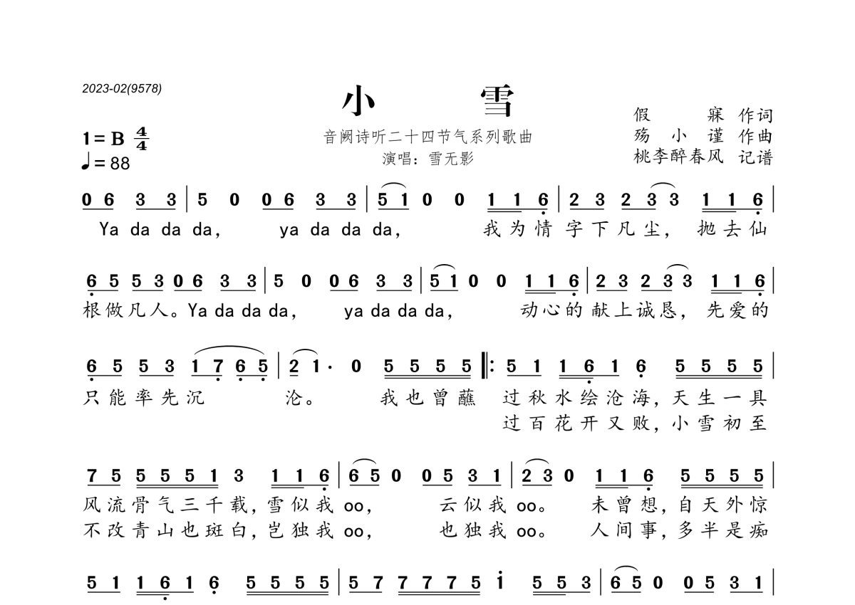 《音阙诗听二十四节气歌之小雪》是雪无影演唱的一首歌曲,拍号为4/4拍,歌曲速度为每分钟88拍,这份简谱共有两张高清图谱,图谱由 @桃李醉春风 编配上传。