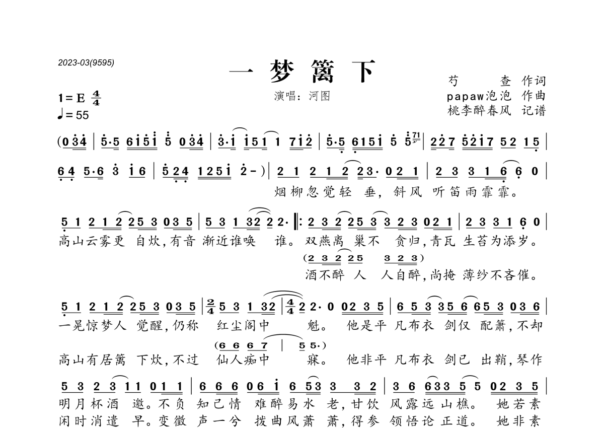 《一梦篱下》是河图演唱的一首歌曲,拍号为4/4拍,歌曲速度为每分钟55拍,这份简谱共有一张高清图谱,图谱由 @桃李醉春风 编配上传。