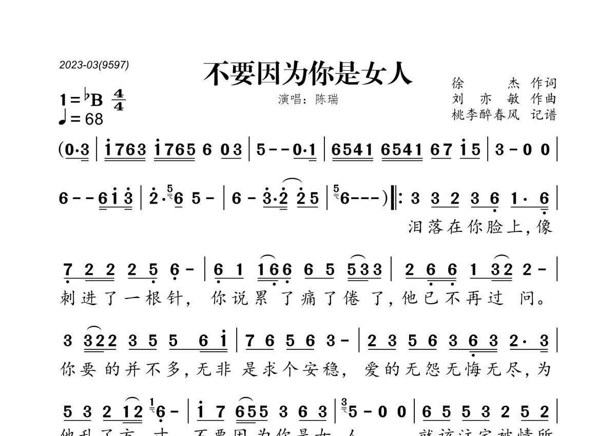 《不要因为你是女人》是陈瑞演唱的一首歌曲,拍号为4/4拍,歌曲速度为每分钟68拍,这份简谱共有一张高清图谱,图谱由 @桃李醉春风 编配上传。