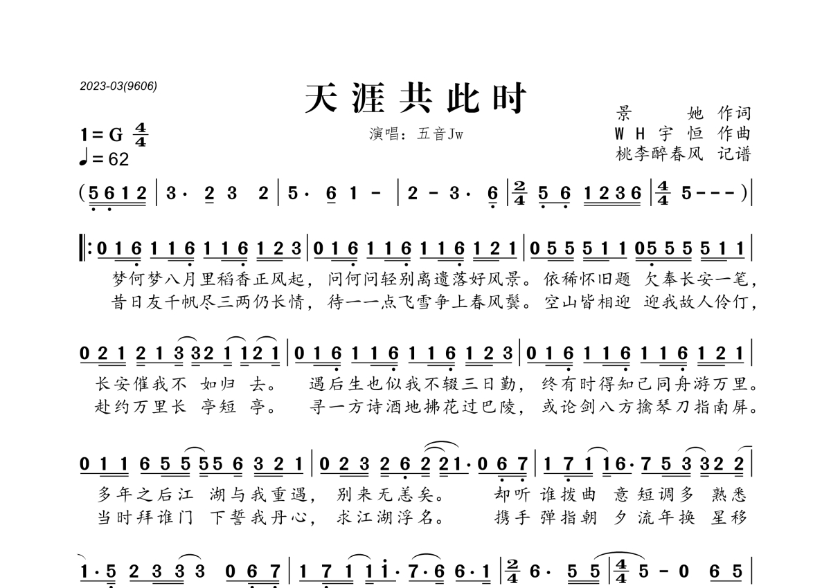 《天涯共此时》是五音Jw演唱的一首歌曲,拍号为4/4拍,歌曲速度为每分钟62拍,这份简谱共有一张高清图谱,图谱由 @桃李醉春风 编配上传。