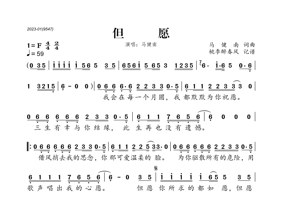 《但愿》是马健南演唱的一首歌曲,拍号为4/4拍,歌曲速度为每分钟59拍,这份简谱共有一张高清图谱,图谱由 @桃李醉春风 编配上传。