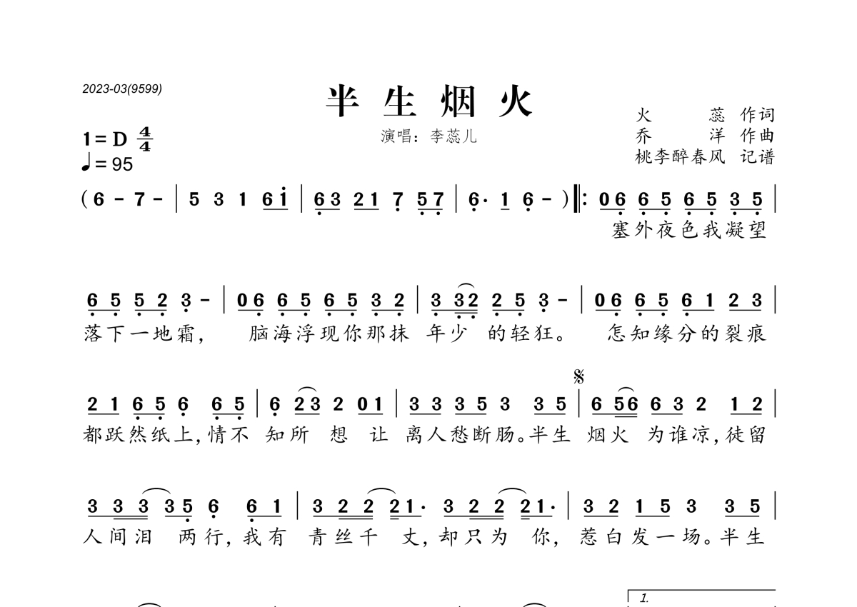 《半生烟火》是李蕊儿演唱的一首歌曲,拍号为4/4拍,歌曲速度为每分钟95拍,这份简谱共有一张高清图谱,图谱由 @桃李醉春风 编配上传。