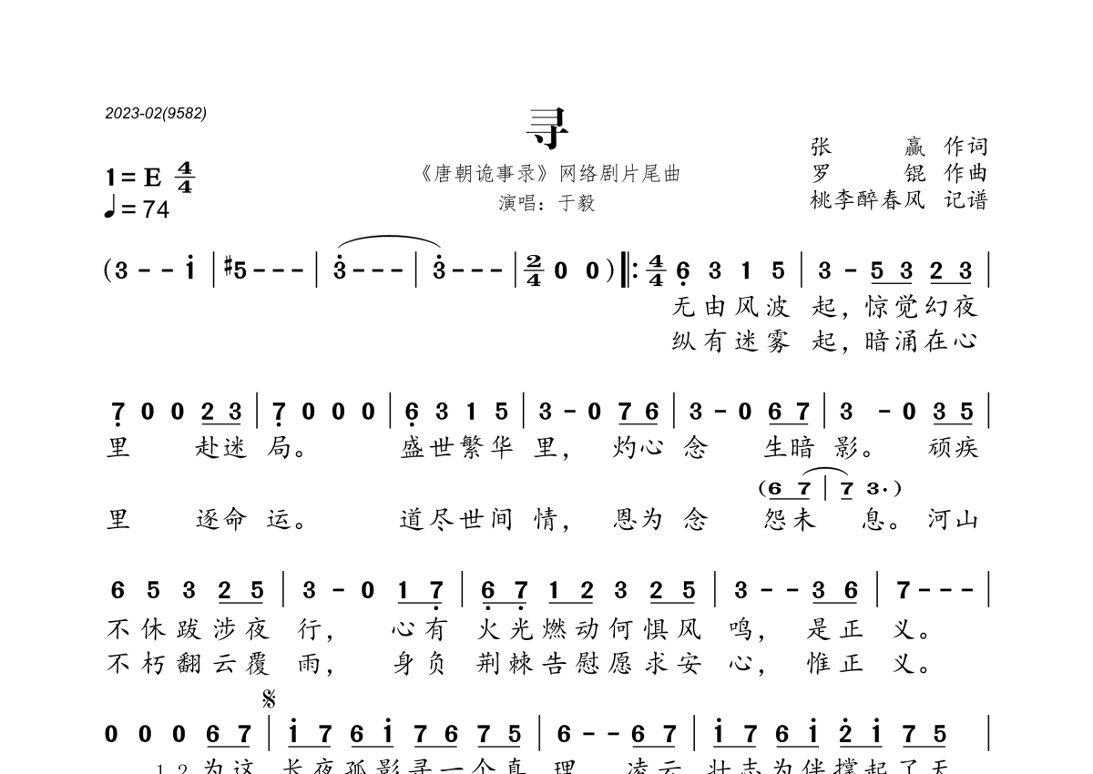 《寻》是于毅演唱的一首歌曲,拍号为4/4拍,歌曲速度为每分钟74拍,这份简谱共有一张高清图谱,图谱由 @桃李醉春风 编配上传。