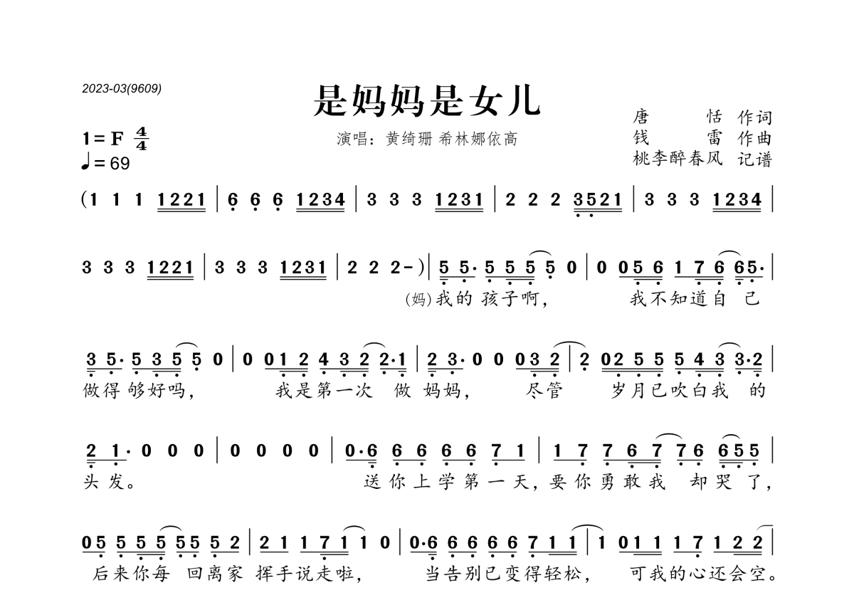 《是妈妈是女儿》是黄绮珊、希林娜依·高演唱的一首歌曲,拍号为4/4拍,歌曲速度为每分钟69拍,这份简谱共有三张高清图谱,图谱由 @桃李醉春风 编配上传。