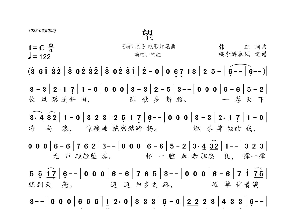 《望》是韩红演唱的一首歌曲,拍号为3/4拍,歌曲速度为每分钟122拍,这份简谱共有一张高清图谱,图谱由 @桃李醉春风 编配上传。