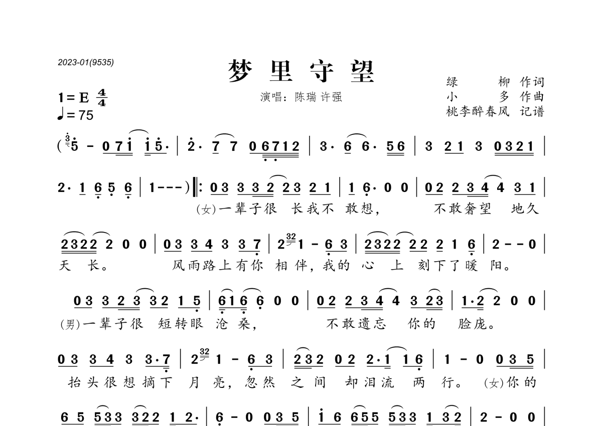 《梦里守望》是陈瑞、许强演唱的一首歌曲,拍号为4/4拍,歌曲速度为每分钟75拍,这份简谱共有一张高清图谱,图谱由 @桃李醉春风 编配上传。