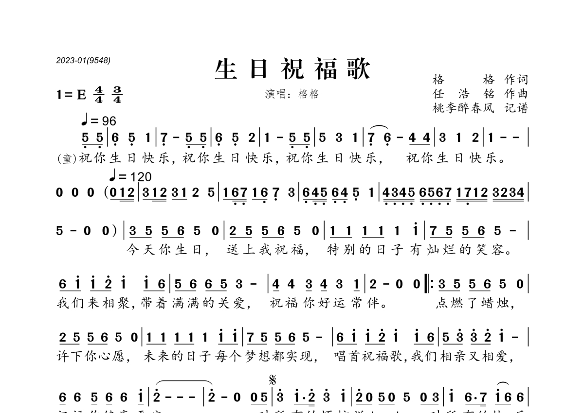 《生日祝福歌》是格格演唱的一首歌曲,拍号为4/4拍,歌曲速度为每分钟96拍,这份简谱共有一张高清图谱,图谱由 @桃李醉春风 编配上传。