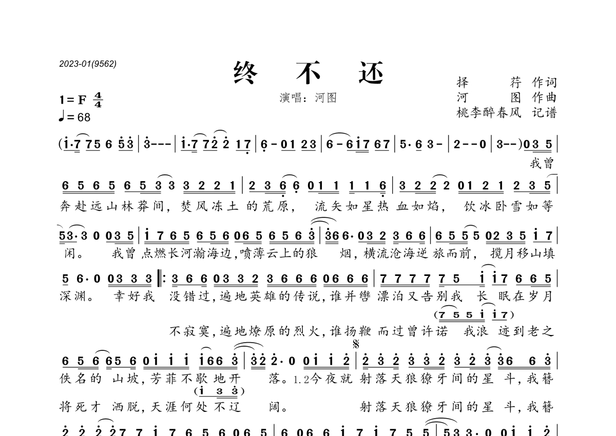 《终不还》是河图演唱的一首歌曲,拍号为4/4拍,歌曲速度为每分钟68拍,这份简谱共有一张高清图谱,图谱由 @桃李醉春风 编配上传。
