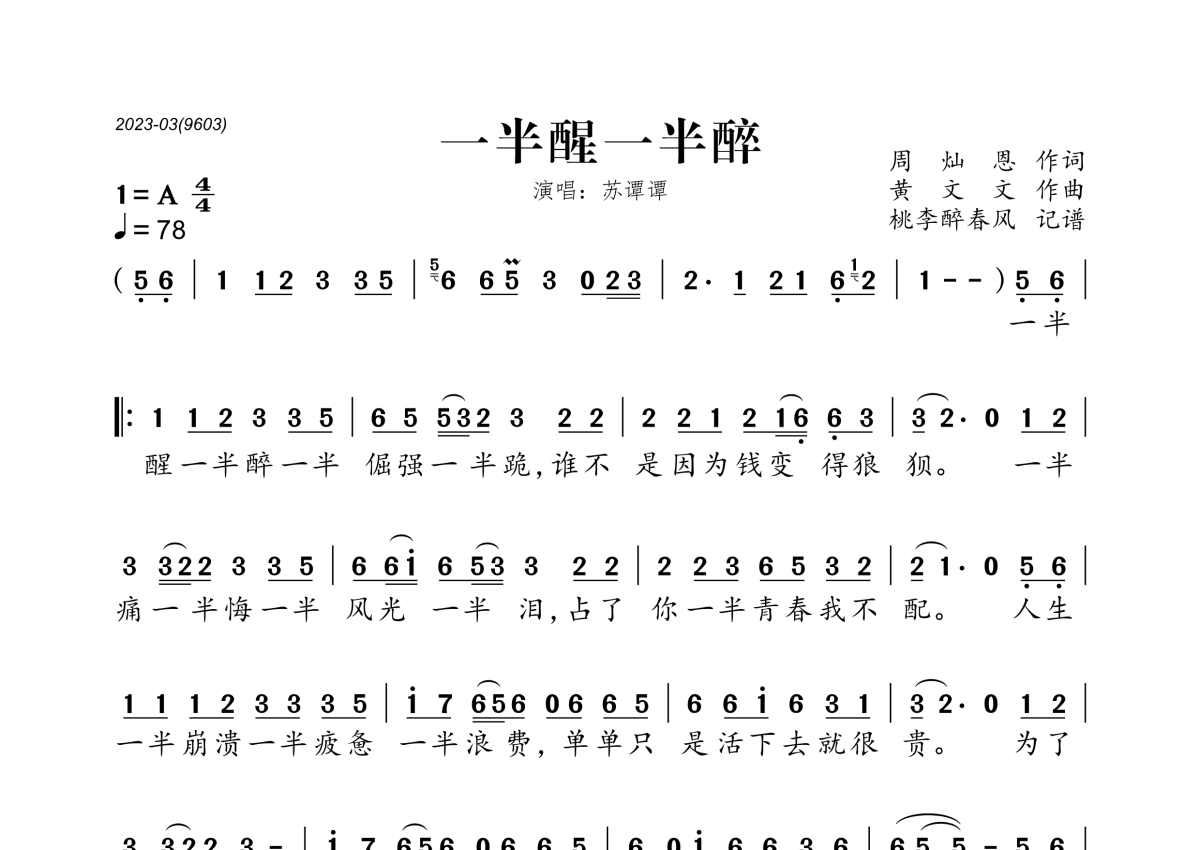 《一半醒一半醉》是苏谭谭演唱的一首歌曲,拍号为4/4拍,歌曲速度为每分钟78拍,这份简谱共有一张高清图谱,图谱由 @桃李醉春风 编配上传。