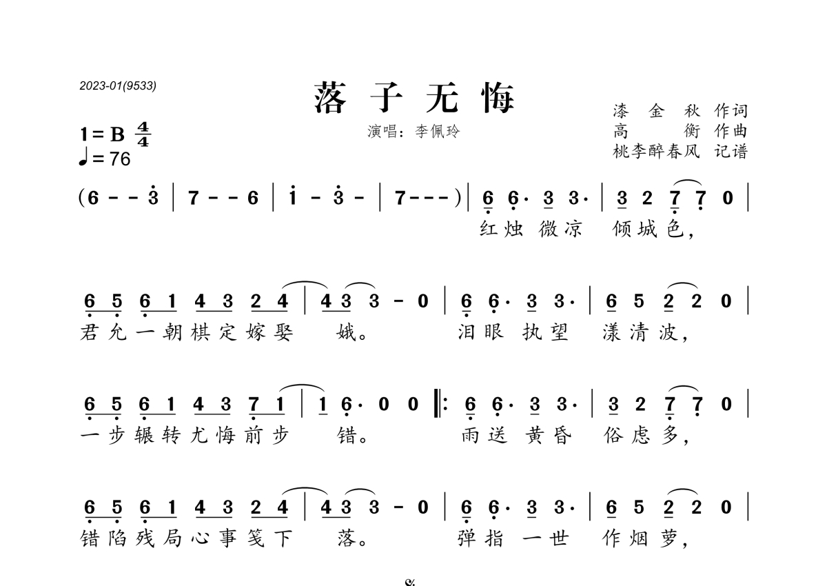李佩玲《落子无悔》简谱