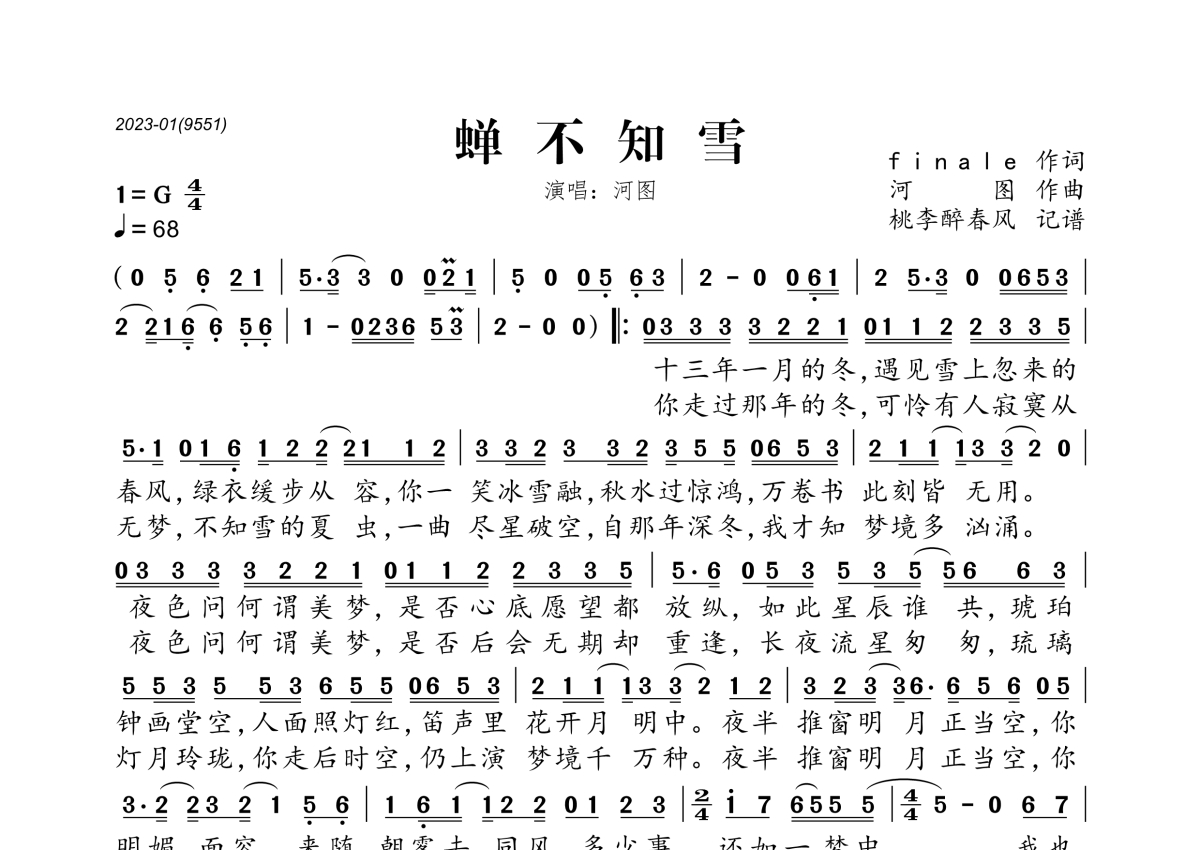 《蝉不知雪》是河图演唱的一首歌曲,拍号为4/4拍,歌曲速度为每分钟68拍,这份简谱共有一张高清图谱,图谱由 @桃李醉春风 编配上传。