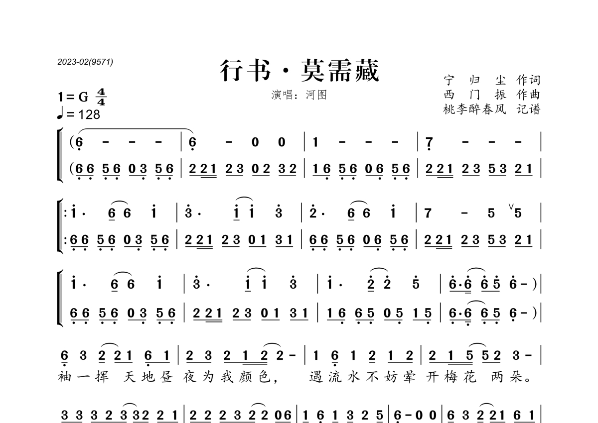 《行书·莫需藏》是河图演唱的一首歌曲,拍号为4/4拍,歌曲速度为每分钟128拍,这份简谱共有两张高清图谱,图谱由 @桃李醉春风 编配上传。
