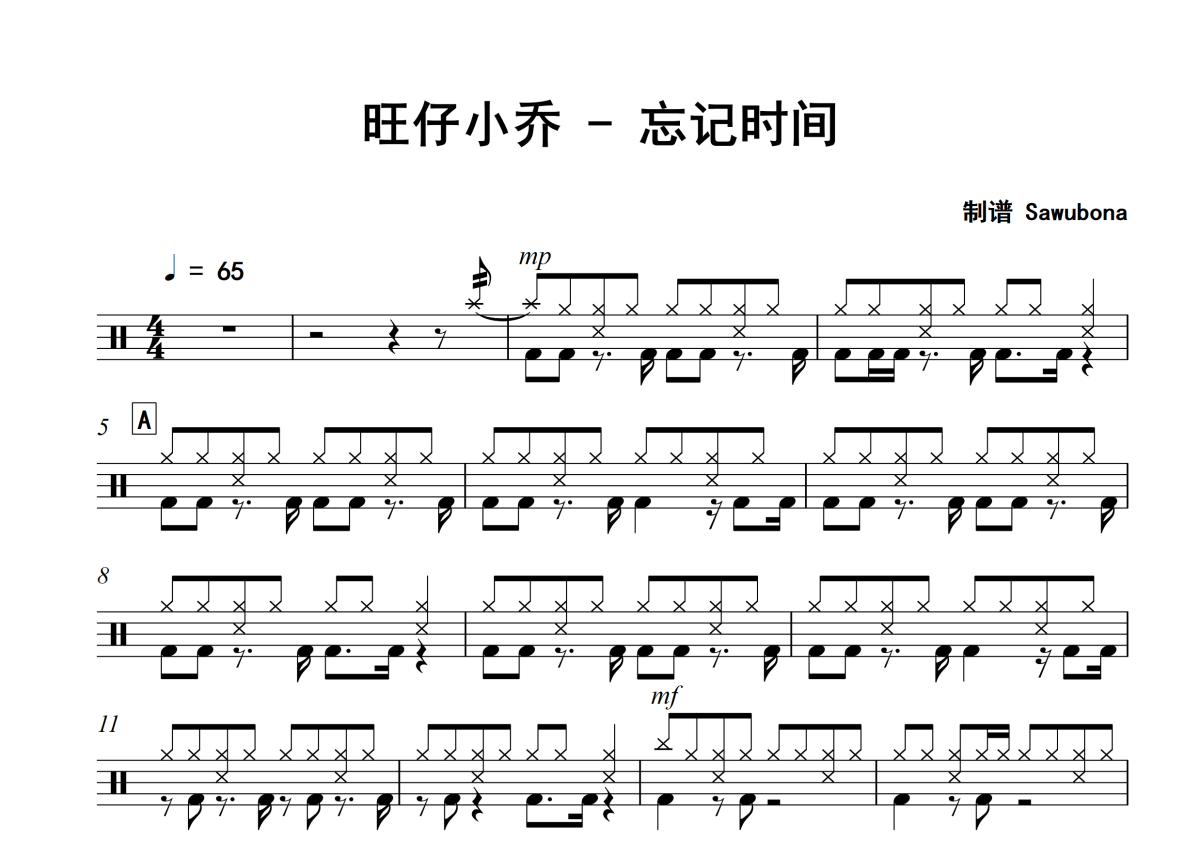 《忘记时间》是旺仔小乔演唱的一首歌曲,拍号为4/4拍,歌曲速度为每分钟65拍,这份架子鼓谱共有两张高清图谱,图谱由 @Sawubona 编配上传,图谱使用五线谱编配,使用这份忘记时间架子鼓谱,你将能够轻松地敲打出这首旺仔小乔的忘记时间,快来尝试吧。