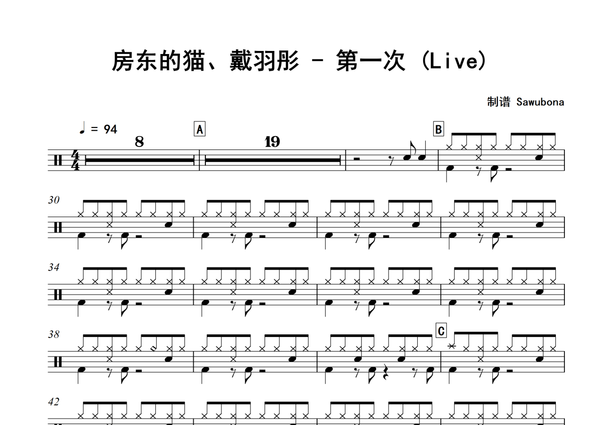 房东的猫、戴羽彤《第一次》架子鼓谱 - Live