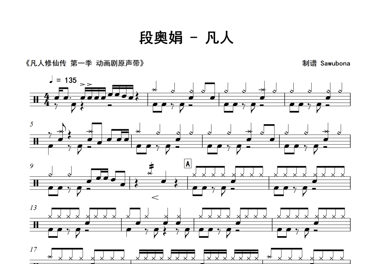 《凡人》是段奥娟演唱的一首歌曲,拍号为4/4拍,歌曲速度为每分钟135拍,这份架子鼓谱共有三张高清图谱,图谱由 @Sawubona 编配上传,图谱使用五线谱编配,使用这份凡人架子鼓谱,你将能够轻松地敲打出这首段奥娟的凡人,快来尝试吧。
