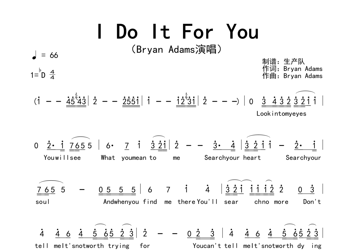 《I Do It For You》是Bryan Adams演唱的一首歌曲,拍号为4/4拍,歌曲速度为每分钟66拍,这份简谱共有两张高清图谱,图谱由 @生产队 编配上传。