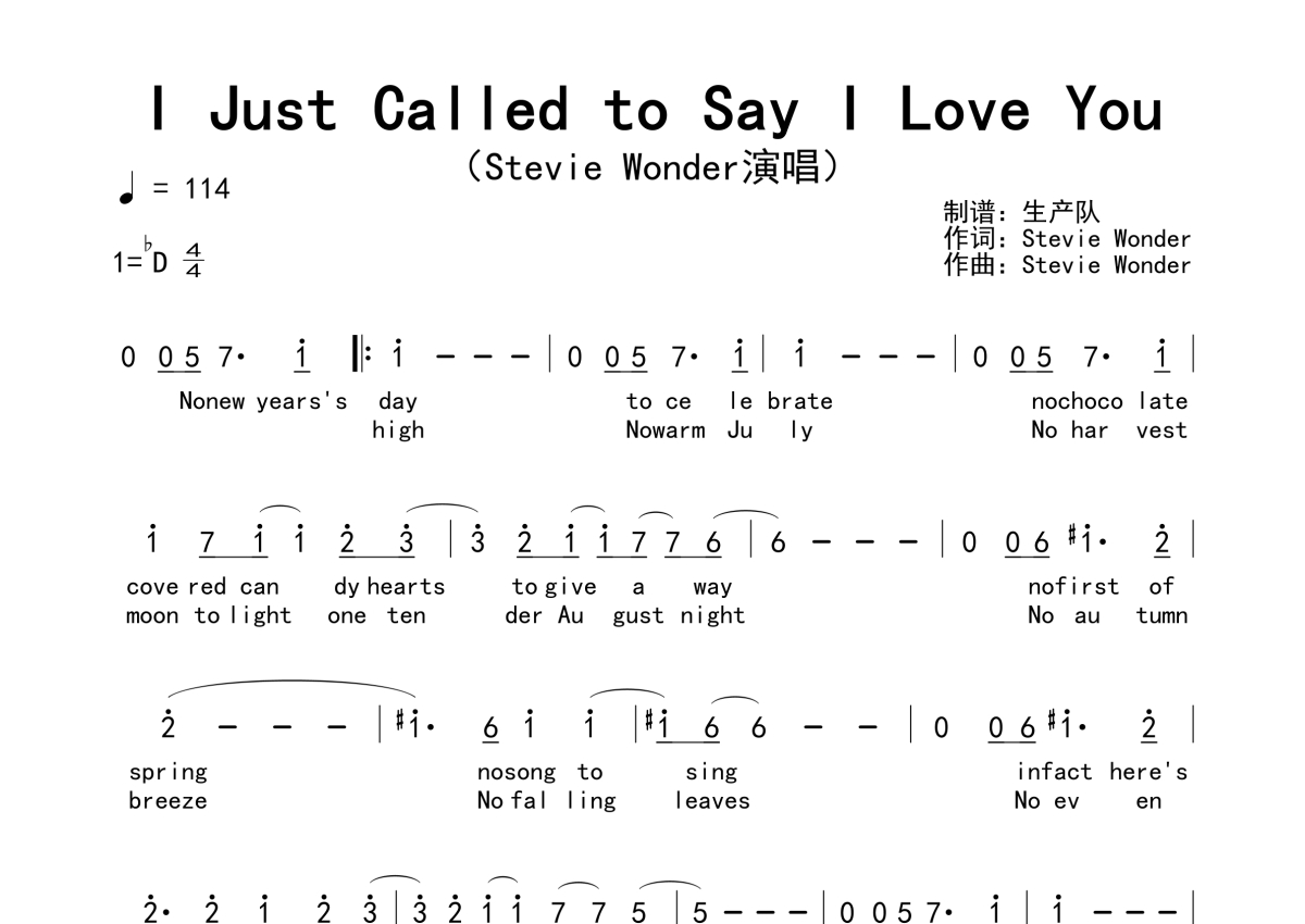《I Just Called to Say I Love You》是Stevie Wonder演唱的一首歌曲,拍号为4/4拍,歌曲速度为每分钟114拍,这份简谱共有两张高清图谱,图谱由 @生产队 编配上传。