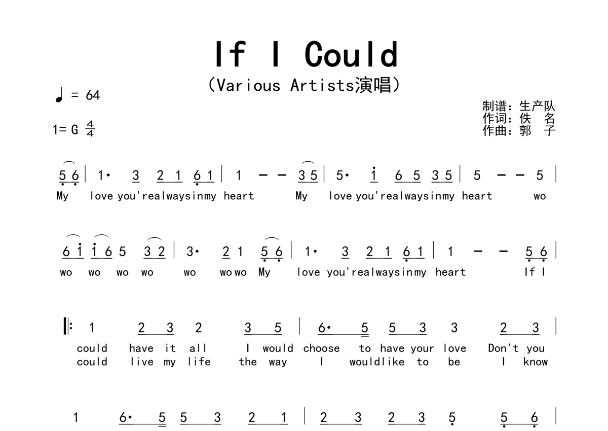 《If I Could》是Various Artists演唱的一首歌曲,拍号为4/4拍,歌曲速度为每分钟64拍,这份简谱共有两张高清图谱,图谱由 @生产队 编配上传。