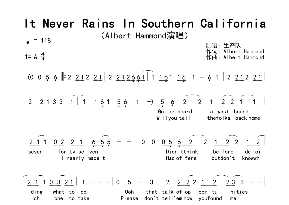《It Never Rains In Southern California》是Albert Hammond演唱的一首歌曲,歌曲速度为每分钟118拍,这份简谱共有两张高清图谱,图谱由 @生产队 编配上传。