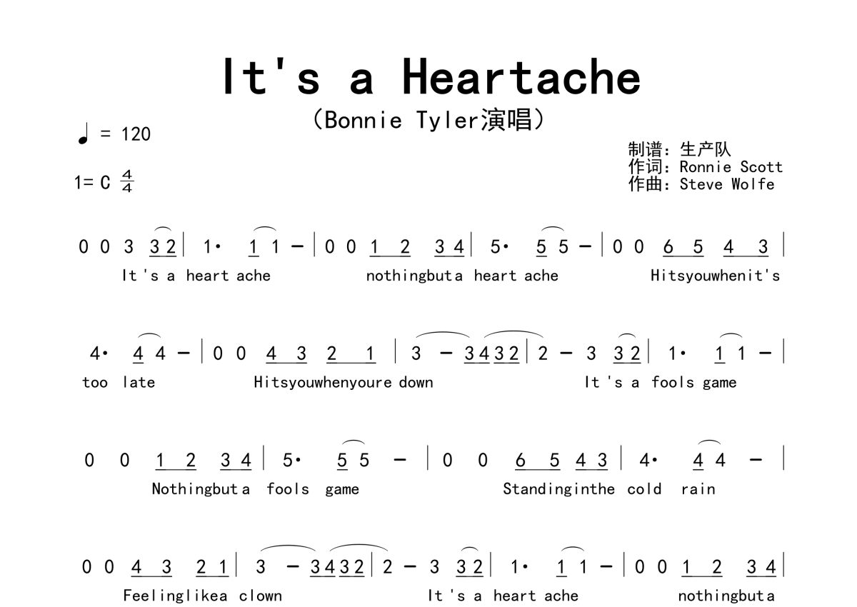 《It's a Heartache》是Bonnie Tyler演唱的一首歌曲,拍号为4/4拍,歌曲速度为每分钟120拍,这份简谱共有两张高清图谱,图谱由 @生产队 编配上传。